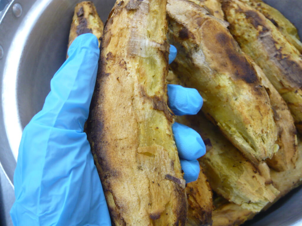 まず、焼き芋を作ります。焼き芋の皮をむき、パンに塗りやすいようにつぶします。