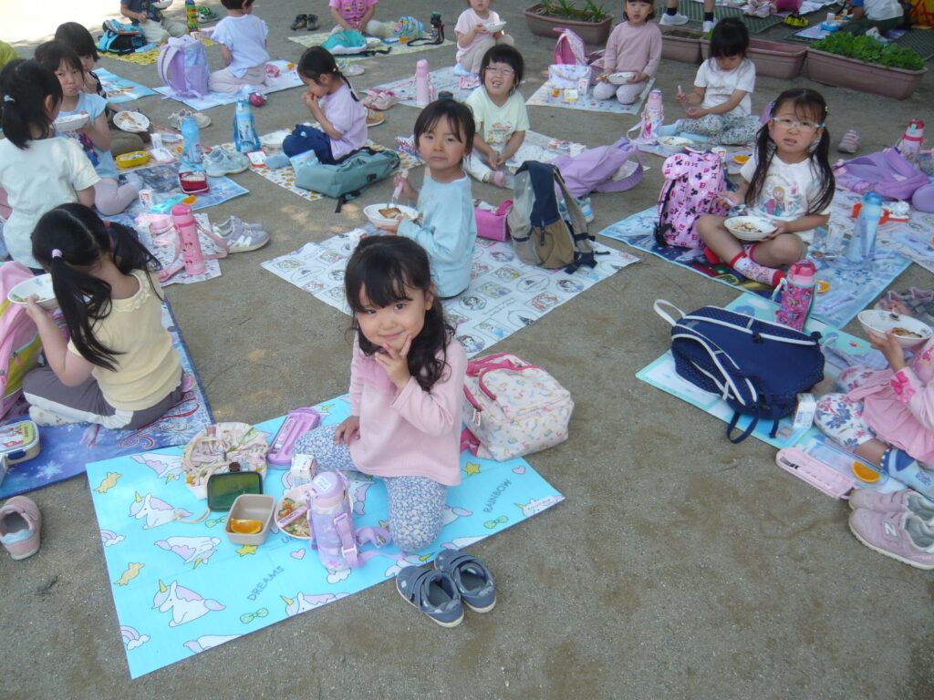 「おむすびの日」は各自レジャーシートを持参し園庭や屋上やお部屋等でお友達とピクニック気分を味わいます。